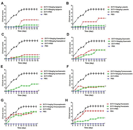 Effects of (A) Apigenin (B) Luteolin (C) Kaempferol (D) Quercetin (E) Isorhamnetin (F) Formononetin (G) Chrysosplenetin and (H) Penduletin on the clinical scores of newborn mice challenged with a lethal dose of EV71. Newborn BALB/c mice were intracranially inoculated with 600,000 TCID50 WT-EV71 within 24 h of birth, followed by intraperitoneal injections of flavonoids in 10% DMSO-PBS at different doses for seven consecutive days. Clinical scores (0, healthy; 1, slow movement; 2, weakness in hind limbs; 3, paralysis in a single limb; 4, paralysis in two limbs; and 5, death) were monitored for 16 days post-infection. N = 15 newborn mice in each group. A one-way ANOVA test was performed to compare the differences between test groups and the virus control with the statistical significance denoted by asterisks, * p < 0.05, *** p < 0.001.