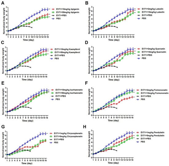 Newborn BALB/c mice were infected with 600,000 TCID50 (lethal dose) of WT-EV71 by intracranial inoculation, within 24 h of birth [28]. Infected mice were intraperitoneally injected with different doses of flavonoids in sterile PBS supplemented with 10% DMSO or with sterile PBS supplemented with 10% DMSO (infected control) daily for seven consecutive days, starting from 2 h post-infection. Uninfected mice injected with sterile PBS supplemented with 10% DMSO were treated as uninfected controls. The mice were monitored daily for signs of morbidity and mortality for 16 days. Severity of illness was evaluated using a graded score (0, healthy; 1, slow movement; 2, weakness in hind limbs; 3, paralysis in a single limb; 4, paralysis in two limbs; and 5, death) as previously reported [29]. In addition, body weight was determined and normalized as