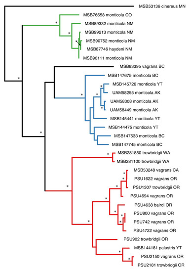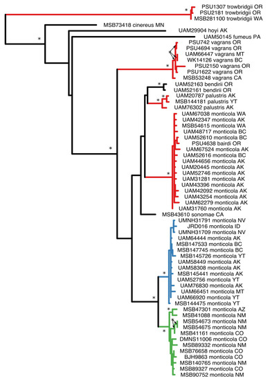 - Demboski, J.R.; Cook, J.A. Phylogeography of the dusky shrew, Sorex monticolus (Insectivora, Soricidae): Insight into deep and shallow history in northwestern North America. Mol. Ecol. 2001, 10, 1227–1240. [Google Scholar] [CrossRef] [PubMed]