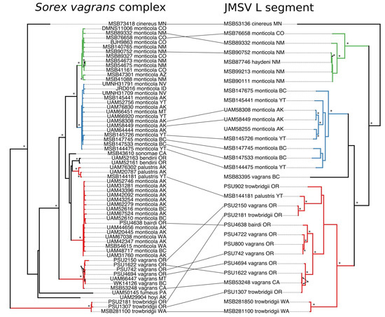 In contrast, the PC clade of JMSV showed a complex pattern of host switching among sympatric, yet often deeply divergent species of shrews along the Pacific coast. While the PC clade is monophyletic in all segments of JMSV, this clade is distributed across four separate host species, hence indicative of widespread host switching. Of note among the JMSV PC clade was the placement of a virus recovered from S. palustris (MSB144181) that was well supported within the PC clade. The host specimen was, however, collected in the Yukon Territory, well within the range of the NC clade of both JMSV and S. monticola. This pattern of host switching was mirrored by the JMSV strains hosted by S. trowbridgii and S. vagrans that were spread across the PC clade and did not form a single species-specific clade. Virus–virus cophylogenies based on the L and S segments largely mirrored each other with the exception of the placement of two JMSV strains recovered from S. trowbridgii from Washington, which likely was an artifact of sequence coverage for those two segments (Figure S6). A single virus recovered from a S. vagrans (MSB83395) specimen from Vancouver Island, British Columbia, was not supported as being a member of any of the three geographic clades within JMSV (Figure 3 and Figure S4). It is important to note, however, that these analyses are based on tree topologies that are not fully resolved, resulting in uncertainty regarding sister relationships within both the host and viral trees, which can impact inferences of codiversification and host switching within this system. More sampling is necessary to resolve tree topologies and fully elucidate the evolutionary history of both the shrew hosts and JMSV.