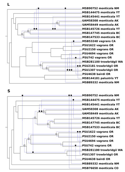While phylogenies for JMSV and its host species largely mirror each other in deeper phylogenetic structure, codiversification is only partially responsible for contemporary diversity. Elevated codivergence metrics calculated between trees suggest host switching also plays an important role. Geoghegan and colleagues [5] applied the nPH85 metric to family level phylogenies for several RNA and DNA viruses. Our results for this metric largely match the general pattern seen for other RNA viruses [5]. When comparing topologies between the host phylogeny and either the S or L segment, we calculated an nPH85 value of 0.8 and 0.76, indicating scant codivergence, which is consistent with the values seen at the family level. Furthermore, when calculated for the comparison between the L and S segments, we obtained a value of 0.5, indicating a mix of codivergence and host switching between each segment. This is in contrast with the tanglegram for the L and S segment comparison (Figure S5) which indicated the phylogenies largely mirrored each other. However, the level of similarity between tree topology and groupings of terminal taxa do not necessarily tell the same story as indicated by drastically different TripL and Trip values compared to nPH85. Internal branching structure is driving the difference in codivergence metrics calculated between phylogenies inferred from the L and S segments. However, our sampling of the L segment is more complete in terms of number of specimens and coverage of the segment. This fact, coupled with our phylogenetic reconciliation analysis, suggests that in addition to a complex history of post-glacial codivergence and local host switching between JMSV and the S. vagrans complex as a whole, there is additional complexity due to independent evolutionary histories associated with distinct viral segments. Increased sampling and full-length genomic sequencing would help test whether incongruity between the S and L segments, both tree topology and similarity metrics, reflects deeper phylogenetic patterns or is merely an artifact of sampling and sequencing bias.