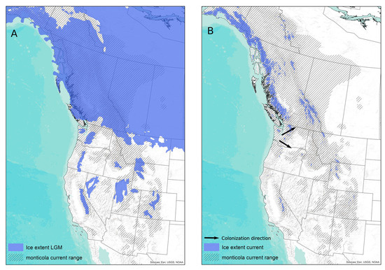 (A) Extent of ice sheets across western North America during the Last Glacial Maximum and the modern distribution of Sorex monticola. (B) Current glacial extent of western North America according to the Global Land Ice Measurements from Space (GLIMS) [52], modern distribution of Sorex monticola, and the hypothesized direction of post-glacial expansion of S. monticola to the North and South.