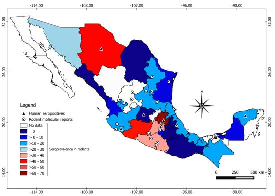 Geographic distribution of rodent and human reports of orthohantaviruses in Mexico. The seroprevalence in rodents is shown in the colored states, the molecular evidence in rodents with circles, and the serological evidence in humans with triangles.
