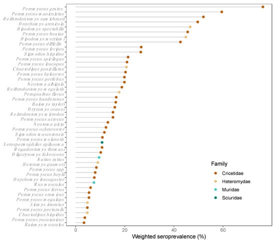 Divided by rodent family, Orthohantavirus seroprevalences were 34.41% in Cricetidae, 34.01% in Heteromydae, 10.60% in Sciuridae and 10.43% in Muridae. This study recorded 43 seropositive species among the 82 analyzed. The seroprevalence by species ranged from 3% to 76% (Figure 2, Table S3). Seropositive individuals were identified from the genera Peromyscus, Reithrodontomys, Sigmodon, Oryzomys and Oligoryzomys, which have species considered to be reservoirs of American orthohantaviruses. Seropositive individuals of the genera Rattus and Mus were also identified and considered reservoirs of Eurasian orthohantaviruses.