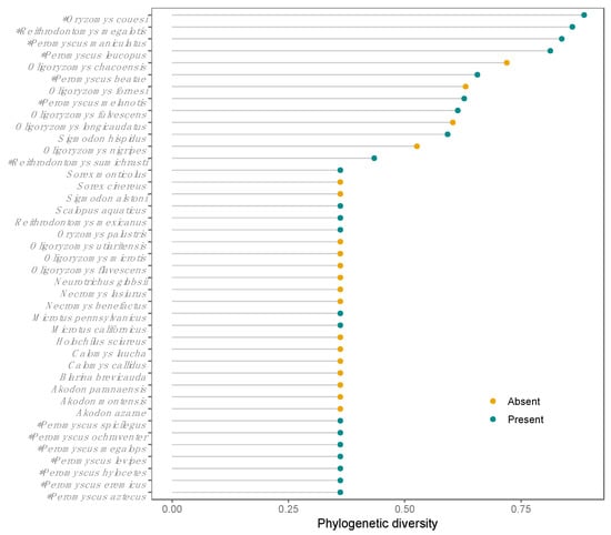 Twenty-two of the 41 species in which Orthohantavirus sequences have been reported in America are distributed in Mexico, and orthohantaviruses have been identified in Mexico in 14 of these species. According to the PD analysis, the rodent species Oryzomys couesi, Reithrodontomys megalotis, Peromyscus maniculatus, and Peromyscus leucopus harbor the highest hantaviruses PD, all of which are widely distributed in Mexico (Figure 3 and Figure 4).