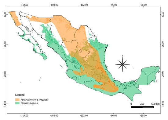 The authors then determined whether or not these species were distributed in Mexico to establish the possible geographic distribution of reservoirs and orthohantaviruses in the country. To do this, maps were built of geographical distribution of the reservoir species currently present in Mexico that harbor the greatest genetic diversity of orthhantaviruses. The distribution layers available in the Geographic Metadata Catalog of the Comisión Nacional para el Conocimiento y uso de la Biodiversidad [,,,] and QGIS Geographical Information System were used.