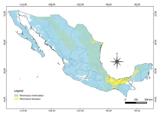 - Ceballos, G.; Blanco, S.; González, C.; Martínez, E. Peromyscus maniculatus (Ratón). Distribución Potencial, Escala: 1:1000000. In Proyecto DS006: Modelado de La Distribución de Las Especies de Mamíferos de México Para Un Análisis GAP; Con Un Tamaño de Píxel: 0.01 Grados Decimales; El Proyecto Fue Financiado Por La Comisión Nacional Para El Conocimiento y Uso de La Biodi; Instituto de Biología, Universidad Nacional Autónoma de México: Mexico City, México, 2010. [Google Scholar]