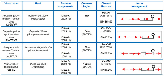 Summary of significant data on the begomoviruses described in this work. SI, sequence identity; ND, not determined (DNA-B is not known). Red arrows represent iterons (Rep-binding sites) and discontinuous arrows represent imperfect repeats; the TATA-box is represented by a square, and the conserved stem-loop element by a balloon-like figure.