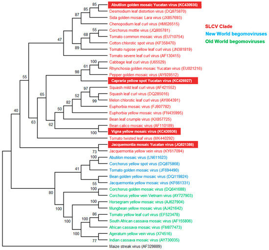 Phylogenetic relationships between the novel begomoviruses (highlighted in red background) and selected begomoviruses. Phylogenetic analysis was based on the alignment of the full-length DNA-A sequences of 24 members of the SLCV clade (highlighted in red), five begomoviruses (BGVs) from New World (highlighted in blue), nine BGVs from Old Word (highlighted in green), and one mastrevirus as outgroup (black). The phylogenetic tree was inferred using the neighbor-joining method. Bootstrap values (1000 iterations) are indicated for each node. GenBank accession numbers are indicated in parentheses.