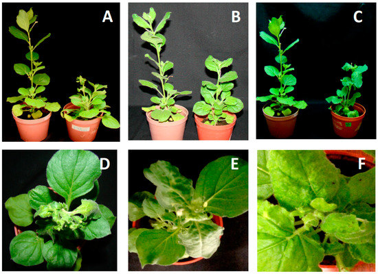 Nicotiana benthamiana plants inoculated with DNA-A and DNA-B of (A,D) JacMYuV, (B,E) CarYMYV, and (C,F) ViMYV. The symptomatic plants (28 dpi) (right side of photography) are compared with mock-inoculated plants (left side).