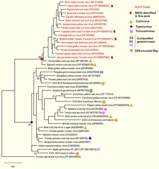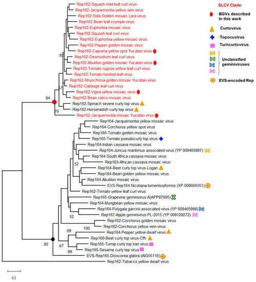 Phylogenetic relationships between the Rep N-terminal domain (aa 1–162) of SLCV-Lin members (highlighted in red) and its homologous of other geminivirus subgroups. The phylogenetic tree was inferred using the maximum likelihood method based on the general reverse transcriptase model. The percentage of trees in which the associated taxa are clustered together is shown next to the branches (1000 iterations). The red filled circle indicates the node of Rep162 of the SLCV cluster, and the black filled circle indicates the main branch of equivalent Rep162 domains of other geminiviruses. EVS, endogenous viral sequences.