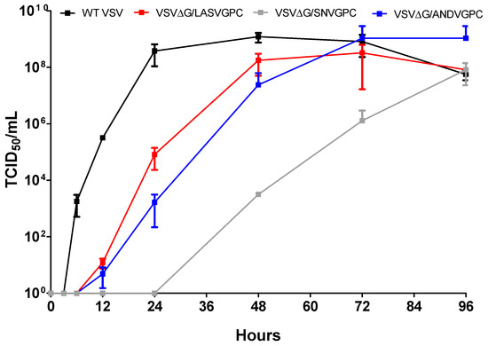 An assay was performed on the following four viruses to assess growth kinetics: Wild type VSV, rVSVΔG/ANDVGPC, rVSVΔG/SNVGPC, and a VSV expressing Lassa virus glycoprotein (rVSVΔG/LASVGPC). Briefly, 12-well plates with VeroE6 cells at 80%–90% confluency were infected in triplicate with each virus at a multiplicity of infection (MOI) of 10−4. Following incubation at 37 °C for 1 h, media was replaced with 1 mL of DMEM + 2% FGS. Plates were incubated at 37 °C and supernatant was collected from each well at time points 0, 3, 6, 12, 24, 48, 72, and 96 hours. The supernatants collected at each time point were used for subsequent TCID50 analysis. Ten-fold serial dilutions of each supernatant were tested in triplicate in 96-well format in DMEM + 2% FGS. A mock-infected row was included per plate as a control. Plates were incubated at 37 °C and cytopathic effect (CPE) was monitored and recorded at 96 h post infection and TCID50’s were calculated using the Reed and Muench method.