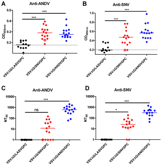 3.2. Immunogenicity of VSVΔG/SNVGPC and VSVΔG/ANDVGPC