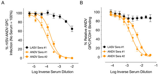 The capacity of hamster sera to block binding of PCDH1 to ANDV GPC was evaluated as described previously [22]. Briefly, 100 ng per well of sEC1-2 (soluble EC1-2, the first two extracellular cadherin domains of PCDH1) was coated onto high-protein binding 96-well plates at 4 °C overnight and blocked with 5% nonfat dry milk in PBS. Pre-titrated amounts of FSL-biotin-labeled rVSV–ANDV GPC particles were then incubated with two-fold serial dilutions (starting at a 25-fold dilution) of hamster sera for 1 h at 37 °C before their application to the ELISA plates. Bound virus particles were detected by Streptavidin–HRP. Data from three independent experiments (average ±SD, n = 9) were expressed as % relative binding by setting no serum well-binding to 100%.