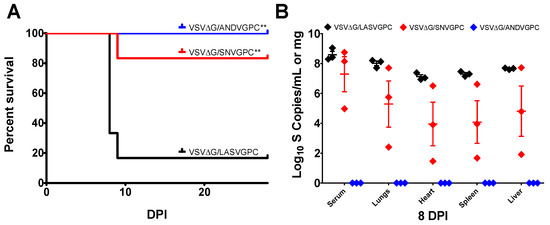 Protective efficacy of rVSVΔG/ANDVGPC and rVSVΔG/SNVGPC against ANDV challenge (A) Survival of hamsters vaccinated with either rVSVΔG/ANDVGPC (n = 6), rVSVΔG/SNVGPC (n = 6), or control vaccine rVSVΔG/LASVGPC (n = 6) following challenge with ANDV. (B) Presence, following ANDV challenge, of ANDV RNA in the serum and tissues in groups of vaccinated hamsters at 8 days post-infection (dpi) (n = 3). Data means + SEM are shown. Statistical significance was determined via log-rank test (A). **, p = <0.01.