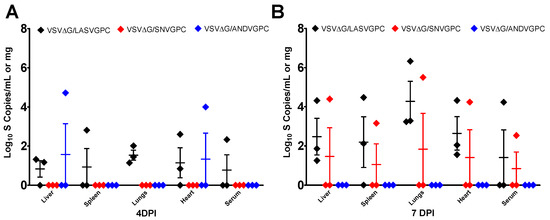 Protective efficacy of rVSVΔG/ANDVGPC and rVSVΔG/SNVGPC against HA-SNV challenge. Presence of SNV RNA in the serum and tissues of vaccinated hamsters at (A) 4 dpi and (B) 7 dpi (n = 3/group) following HA-SNV challenge. Data means + SEM are shown.