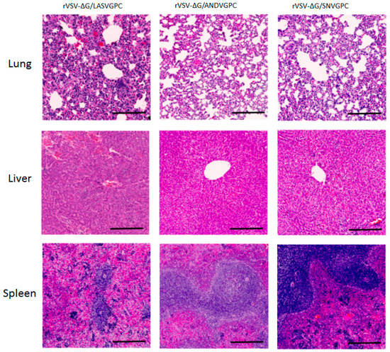 Histopathology of organs in vaccinated hamsters. Hematoxylin and eosin staining was performed on the lungs, livers, and spleens of hamsters on day 7 post-ANDV infection, following vaccination with either VSVΔG/LASVGPC, VSVΔG/ANDVGPC, or VSVΔG/SNVGPC. Scale bar = 200 µm.