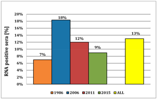 In all of the sera tested from 1986 to 2018, only four had weak positive results in qRT-PCR for the presence of Linda virus. However, all of them were false positive as none of them could be confirmed by sequencing, i.e., the sequences obtained were completely unspecific.