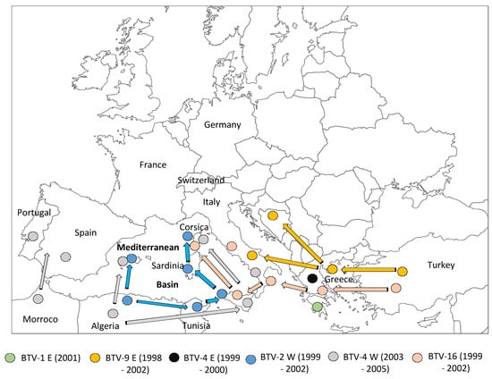 Until 1998, incursions of BTV into the Mediterranean Basin or South Europe were relatively infrequent and did not persist. From 1998 to 2005, at least seven strains from five different BTV serotypes (serotypes 1, 2, 4, 9, and 16) were detected in the Mediterranean Basin [21] (Figure 1). This new distribution of strains and serotypes is due to various factors, including increased global trade and climate change [1,22,23]. Climate change may be involved in this new pattern of BTV distribution by its impact on the vectorial capacity of resident Culicoides insect populations in previously virus-free regions, such as much of the Mediterranean Basin and European countries [1]. These BTV strains have been introduced to the Mediterranean Basin and to Europe through two corridors: eastern viruses via Turkey and Greece, and western viruses via North Africa [24]. In the case of western viruses, BTV first spread to North Africa, then to the Mediterranean islands, and finally to southern European countries.