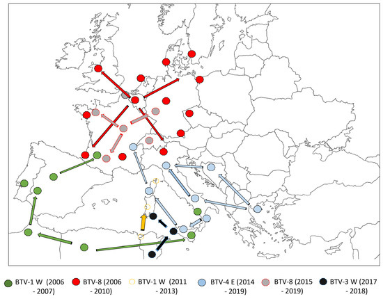 Concomitantly with these introductions of BTV from countries bordering the Mediterranean Basin, European countries faced new BTV incursions of unknown origin.