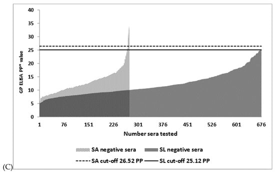 Cut-off values were determined as mean +3 standard deviations (SD) of PP values recorded in SA and SL IgG EBOV negative serum panels and also selected at 95% accuracy level by the misclassification cost term (MCT) option of the two-graph receiver operating characteristics (TG-ROC) analysis available from Microsoft Excel 2010 (Redmond, WA, USA) [,] using SL reference IgG EBOV negative and positive serum panels. Coefficient of variation (CV) values were calculated to measure relative variability using the formula CV = (SD of replicates/mean of replicates) × 100.