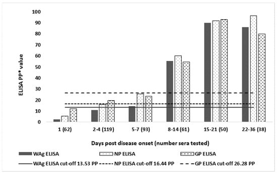 I-ELISA, represents one of the simplest ELISA formats, but can be difficult to validate because of signal amplification of both specific and non-specific components []. For these reasons, to determine the specific binding of antibody, sera should be tested with both a specific viral antigen and its corresponding control or comparison antigen to account for possible non-specific background activity. The GP I-ELISA evaluated in our study was based on a commercially available recombinant GP for which a negative control could not be obtained. Compared to WAg and NP I-ELISAs, which included control antigens, the higher GP I-ELISA test values in EBOV negative serum panels and consequently the higher PP cut-off values derived for this assay are likely due to not having a control antigen. Due to inherent differences amongst assay systems, binding-antibody levels should be expressed in relative rather than absolute terms. One of the advantages of using PP values as a measure of antibody activity in the I-ELISA is that this method of OD readings conversion does not assume a uniform background activity, and therefore it is also more suitable for inter-laboratory standardization [].