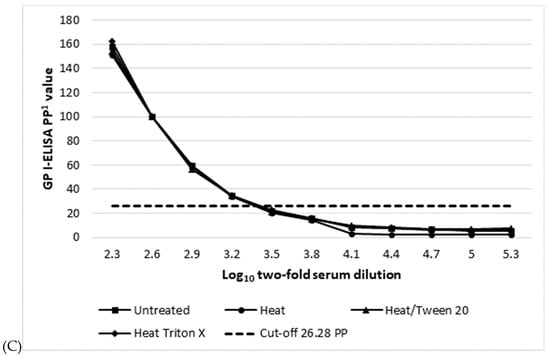 To evaluate the effect of serum inactivation on the levels of the detectable anti-EBOV IgG by WAg, NP and GP I-ELISAs, laboratory protocols previously shown to completely inactivate EBOV virus in human serum were used [,]. Briefly, the C++ was first diluted 1:10 in PBS containing either 0.5% Triton X-100 or 0.5% Tween-20 (Sigma-Aldrich, Taufkichen, Germany) and heated at 60 °C for 15 min. Then, two-fold log10 dilutions (from 1:100 to 1:200,480; log10102−log10105.3) of untreated and treated serum was tested by each of the I-ELISAs. Each dilution was tested in duplicate on 3 separate runs. A serum titer was considered the highest sample dilution at which its PP value was ≥ the I-ELISA cut-off for at least 50% of six replicates.
