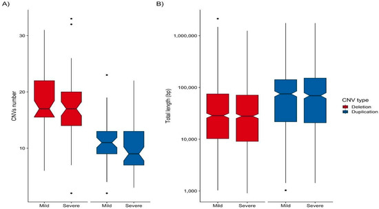 | CNV Number | Genome Coordinates (GRCh38/hg38) | OR (95% CI) | p-Value | Gain/Loss | Severe (n = 60) | Mild (n = 51) | * Distance to Closest Gene (bp) | Putative Affected Gene | Cytoband |