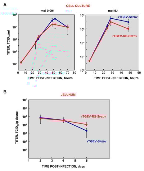 Growth kinetics of rTGEV-SPEDV viruses. (A) Viral growth in cell cultures. Vero cells were infected with rTGEV-SPEDV (blue) or rTGEV-RS-SPEDV (red) viruses at MOI of 0.001 (left panel) or 0.1 (right panel). Aliquots of culture supernatants were recovered at the indicated times post-infection, and virus titers analyzed. The values represent viral titers from three independent experiments. (B) Replication of rTGEV-SPEDV viruses in enteric tract. Five-day-old piglets were orally inoculated with 106 TCID50/piglet. Jejunum samples were taken at the indicated times post-infection, and virus present in the samples was titrated. The values represent viral titers from three different animals. Error bars represent the standard deviation for each value.