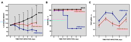 Virulence of rTGEV-SPEDV viruses in suckling piglets. Five-day-old piglets were orally inoculated with 106 TCID50/piglet. Animals were mock infected (mock, black) or infected with rTGEV-SPEDV (blue) or rTGEV-RS-SPEDV (red) viruses. Clinical signs were observed daily. Weight loss (A) and survival (B) are represented. The values are the mean from nine independent animals. (C) Virus load in feces was evaluated by RT-qPCR. Error bars represent the standard deviation for each value; p values, * <0.05, ** <0.01, *** <0.001.