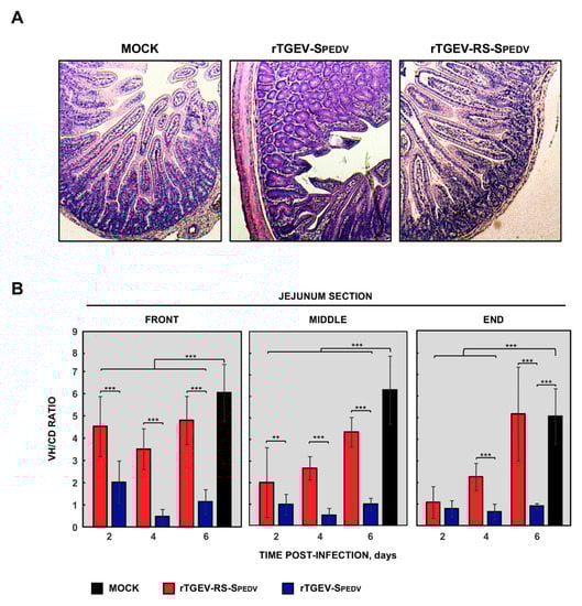 Intestinal damage in suckling piglets infected with rTGEV-SPEDV viruses. (A) Representative hematoxylin-eosin-stained front sections from non-infected animals (mock), or animals infected with rTGEV-SPEDV or rTGEV-RS-SPEDV viruses, at six days post-infection. Pictures were obtained with a 2.5× objective. (B) Villous height to crypt depth (VH/CD) ratio in front, middle, and end sections at different days post-infection. Non-infected animals (black), or animals infected with rTGEV-SPEDV (blue) or rTGEV-RS-SPEDV (red) viruses. Represented values are the mean from three independent animals, two fields per section. Error bars represent the standard deviation for each value; p values, ** <0.01, *** <0.001.