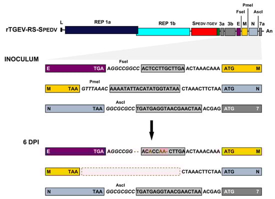 Genetic stability of rTGEV-RS-SPEDV vaccine candidate. Five-day-old piglets were orally inoculated with 106 TCID50/piglet. Jejunum samples were taken at 2, 4, and 6 days post-infection. RNA from these samples was extracted, virus was detected by RT-PCR, and the detected bands were sequenced. The modifications introduced in the recombinant virus used to inoculate the piglets (inoculum) were represented as in Figure 1C. The sequence changes observed at day 6 post-infection are represented in red: Dashes indicate nucleotide deletions, red nucleotides represent point mutations, and dashed box indicates large nucleotide deletion.