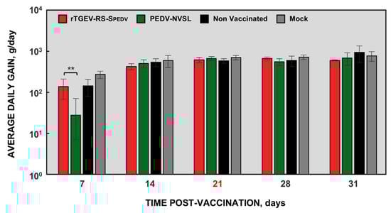 Weight gain in vaccinated animals. Three-week-old pigs were divided into four groups. Animals from two groups were vaccinated with 106 TCID50/animal of rTGEV-RS-SPEDV virus (red) or a virulent US PEDV strain (PEDV-NVSL, green). Three weeks after vaccination (21 dpv indicated in red), non-vaccinated animals were either mock infected (Mock, grey) or challenged with 107 TCID50/animal of a virulent PEDV strain (Non Vaccinated, black). Vaccinated animals were also challenged with the same dose as non-vaccinated animals. Clinical signs and weight were observed daily after vaccination and challenge, and once per week during the course of the experiment. Average daily gain represents the mean from six different animals. Error bars represent the standard deviation for each value; p value, ** <0.01.