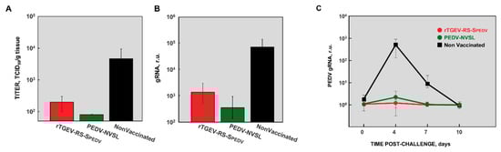 PEDV titers in the enteric tract of animals vaccinated and challenged with virulent PEDV. Four days after the challenge with a virulent PEDV strain, jejunum samples were collected from three piglets per group. Virus presence in these samples was analyzed by titration in Vero cells (A) or by RT-qPCR (B). In addition, PEDV challenge virus shedding in fecal samples was evaluated at different days after challenge, by RT-qPCR (C). Animals vaccinated with rTGEV-RS-SPEDV virus (red); pigs vaccinated with the virulent US PEDV-NVSL strain (green); non-vaccinated and challenged animals (black). Error bars represent the standard deviation for each value.