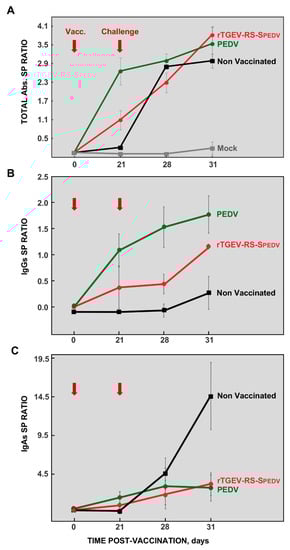 To further analyze the humoral response specific for PEDV, the levels of PEDV-specific IgGs (Figure 8B) and IgAs (Figure 8C) were evaluated. The data were similar to those obtained for total anti-PEDV antibodies. It has been demonstrated that protection against PEDV infection correlates with IgA levels [21,44,59,60]. It is worth noting that IgA levels in the sera of vaccinated animals, after challenge, were significantly reduced compared with non-vaccinated animals (Figure 8C), strongly suggesting that challenge virus did not elicit a potent IgA response in the gut of vaccinated animals, most likely due to reduced replication in the enteric tract, correlating with protection.