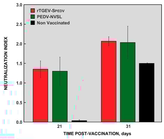 Neutralizing antibodies produced in vaccinated animals. Virus neutralization assay was performed using serum samples, collected before (21 dpv) or after (31 dpv) challenge, from rTGEV-RS-SPEDV virus (red) or PEDV-NVSL (green) vaccinated animals, and from non-vaccinated and challenged animals (black). The values represent neutralization index from three different animals. Error bars represent the standard deviation for each value.