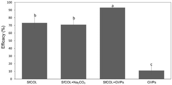 | Efficacy (%) | 0 | 96.7 a | 96.7 a | 100.0 a | 100.0 a |