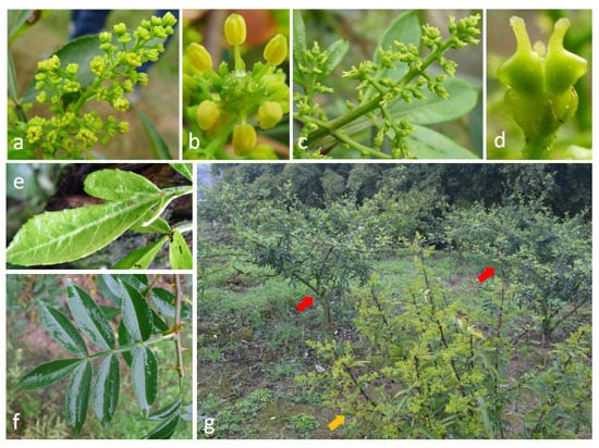 (a,b,e) Green Sichuan pepper plant infected with flower yellowing disease (FYD) exhibiting yellowing and tumescent stamen, and yellowing and small leaf. (c,d,f) Normal stamen and leaf of healthy plant. (g) The FYD-affected tree (yellow arrow) among asymptomatic trees (red arrows).