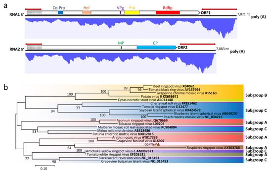 (a) Genomic structure of green Sichuan pepper-nepovirus (GSPNeV) and distribution profile of transcriptomic reads from GSPNeV. The colorful blocks in putative proteins represent conserved amino acid domains or motifs. Co-Pro: Proteinase co-factor. Hel: Helicase. VPg: Viral protein linked to the genome. Pro: Proteinase. RdRp: RNA dependent RNA polymerase. Poly (A): A 3′ terminal poly (A) tail. Similar-sized double-headed red arrows indicate extensive regions of identical nucleotides between RNA1 and RNA2; dotted areas at 5′ end of coding region indicate extensive region of identical amino acids; (b) maximum-likelihood relationships [Jones-Taylor-Thornton (JTT) model] inferred from amino acid sequence alignments of the conserved CG-GDD region between Pro and RdRp domains of GSPNeV (marked with small red triangle) and representative nepoviruses divided into three subgroups (A, B, and C). Bootstrap support (as a percentage of 1000 replicates) is shown at the nodes for values greater than 50%. Accession numbers are supplied in taxa names.