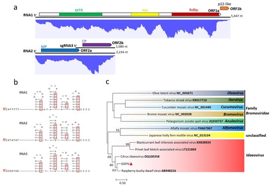 (a) Genomic structure of green Sichuan pepper-idaeovirus (GSPIV) and distribution profile of transcriptomic reads from GSPIV. The colorful blocks in proteins represent conserved amino acid sequences, domains or motifs. MTR: Methyltransferase. Hel: Helicase. RdRp: RNA dependent RNA polymerase. p12-like: Putative p12-like protein. MP: Movement protein. CP: Coat protein. sgRNA3: Subgenomic RNA3; (b) first seven nucleotides of 5′ genomic terminus and, stem-loops and the last conserved five cytidines (C) of 3′ genomic terminus from RNA1, 2 and sgRNA3 are shown. The identical nucleotides at the stem shared among the RNAs are indicated with red boxes; (c) maximum-likelihood tree (JTT model) derived from entire CP amino acid sequence comparisons of GSPIV (marked with small red triangle), representative idaeoviruses, and related viruses. Bootstrap support values (as a percentage of 1000 replicates) are shown at the nodes if greater than 50%. The accession number is given in taxa names.