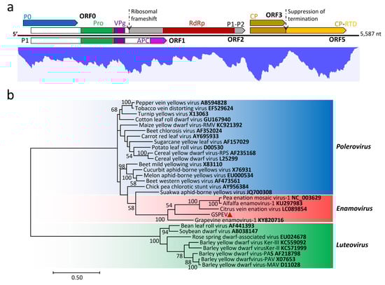 The GSPEV genome of 5587 nt is the smallest among enamoviruses. Its genome organization is typical of enamoviruses, consisting of five ORFs (Figure 4a). GSPEV has a 5′ UTR (90 nt) shorter than that of other enamoviruses (180–334 nt), but the size of its 3′ UTR (211 nt) is similar to that of others (201 nt to 315 nt). ORF0 (nt 91–993) encodes a putative P0 (300 aa, 33.2 kDa), which potentially functions as an RNA silencing suppressor [34]. ORF1 (nt 218–2446) partially overlaps ORF0 and encodes putative P1 of 742 aa (81.1 kDa) by means of ribosomal leaky scanning. P1 has a 3C-like serine peptidase domain (aa 273–455) and a potential APC basic domain (aa 650–739) [35]. Alignment of the P1 aa sequences of GSPEV and other enamoviruses revealed features related to VPg, namely the upstream aa cleavage site E454/S and downstream conserved W513AD motif followed by a D/E-rich region [36]. Translation of the P1-P2 fusion protein (1168 aa, 129.7 kDa) by ORF2 (nt 1819–3723) is possibly guided by viral transcription of a G1819GGAAAC1825 signal and a potential pseudoknot (nt 1833–1851) with -1 ribosomal frameshift from ORF1 [37]. The fusion protein contains an RdRp domain (nt 721–1106). ORF3 (nt 3802–4395) encodes a putative CP protein of 197 aa (21.4 kDa). ORF5 (nt 4396–5376), with suppression of ORF3 termination, is responsible for expressing a putative CP-RTD fusion protein (524 aa, 57.0 kDa), which contains a readthrough protein domain (aa 227–513) and is essential for aphid transmission [38]. The C-rich CCNNNN tandem repeat sequences (nt 4408–4463) associated with the readthrough mechanism are located at downstream of the readthrough site A4390AAUAGGAG4398 [39].