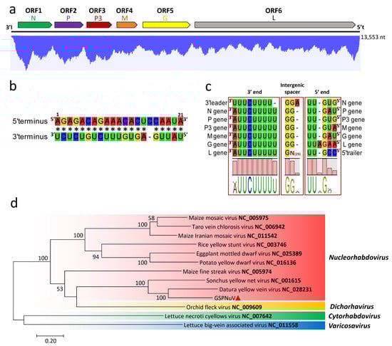 (a) Genomic structure of green Sichuan pepper-nucleorhabdovirus (GSPNuV) and profile distribution of transcriptomic reads from GSPNuV. N, P, P3, M, G, and L are putative nucleocapsid protein, phosphoprotein, movement protein, matrix protein, glycoprotein, and polymerase, respectively. 3’l and 5’t are a leader sequence at 3′ genomic terminus and a trailer sequence at the 5′ terminus, respectively; (b) the complementary sequences of the 5′ and 3′ termini (asterisk indicates complementary bases); (c) conserved gene junction sequences interposed between two adjacent genes; (d) phylogenetic tree generated using the maximum-likelihood method (JTT model) and 1000 bootstrap replicates, based on alignment of amino acid sequences of the L genes from GSPNuV (marked with small red triangle) and related viruses. Bootstrap percent values greater than 50 are shown at the nodes. The viral accession number is marked in bold in taxa names.