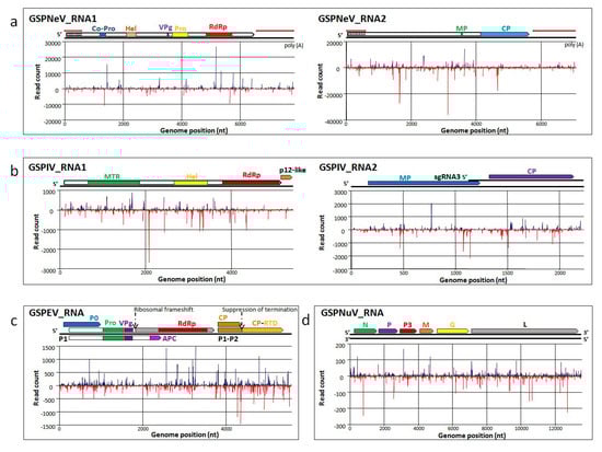 The vsiRNA read distribution across the genome of GSPNeV (a), GSPIV (b), GSPEV (c) and GSPNuV (d); the blue lines above the genome and red lines beneath the genome represent mapped genomic and anti-genomic vsiRNAs, respectively.