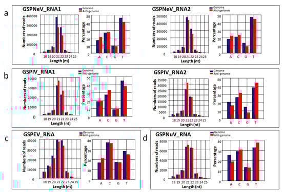 The vsiRNA size distribution, and 5′ end nucleotide preference of GSPNeV (a), GSPIV (b), GSPEV (c), and GSPNuV (d).