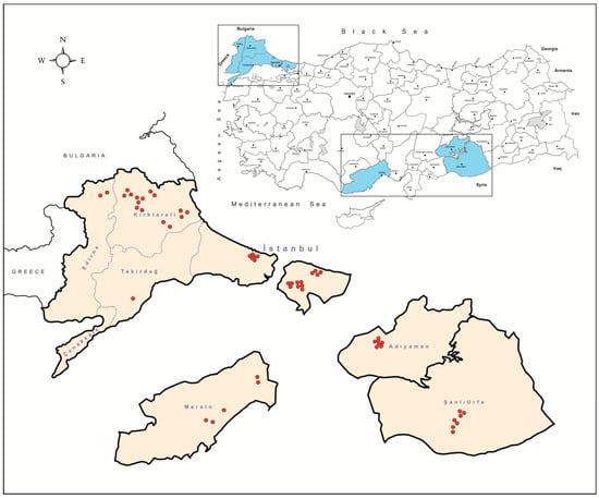 The tick specimens were collected at 37 locations in Istanbul (Northwest Anatolia, Thrace region), Edirne, Kırklareli, and Tekirdağ (Thrace region), Mersin (Southern Anatolia, Mediterranean region), Adıyaman and Şanlıurfa (Southeastern Anatolia) provinces, between 2013–2018 (Figure 1). Collections in the Istanbul province was carried out by flagging, using a 75 × 100 cm cloth, over both low and high vegetation. All other ticks were collected directly from infested cattle (Bos taurus), sheep (Ovis aries), goats (Capra aegagrus hircus), and dogs (Canis familiaris), at privately-owned farms or animal shelters. All specimens were kept in separate vials, transferred to the laboratory in dry ice and identified morphologically to the species level using appropriate taxonomic keys [,,,,]. Subsequently, the specimens were pooled according to the collection site, species, and developmental stage of up to a maximum of 50 individuals per pool and stored at −80 °C for further analyses.