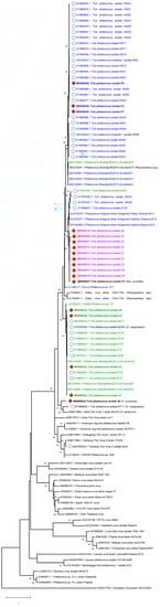 - Kumar, S.; Stecher, G.; Li, M.; Knyaz, C.; Tamura, K. MEGA X: Molecular evolutionary genetics analysis across computing platforms. Mol. Biol. Evol. 2018, 35, 1547–1549. [Google Scholar] [CrossRef]