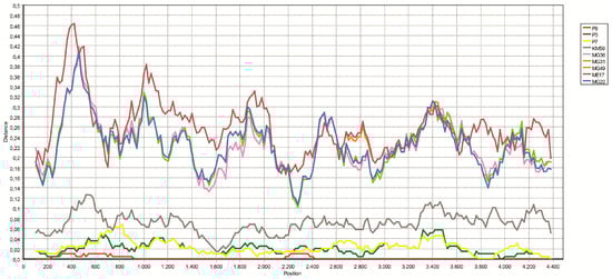Plots of similarity of the near-complete polymerase coding alignment (4480 bp) of tick phlebovirus Anatolia 1 isolate KM2 (MG764521) with closely-related strains (GapStrip: On, Reps: 1000, Maximum Likelihood, T/t: 2.0). The curves indicate comparisons between the target and reference genomes (P9: MN069029, P3: MN069028, P7: MN069030, KM59: MG764522, MG36: KY979167, MG31: KY979166, MG49: KY979168, ME17: MG764523, MG22: KY979165). Each point plotted is the percent identity within a sliding window 200 bp, wide centered on the position plotted, with a step size between points of 20 bp.