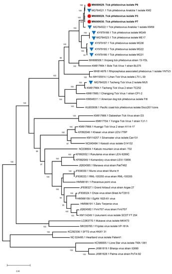 The maximum likelihood analysis of the L segment near-complete coding sequences of tick phleboviruses (4642 bp). The tree is constructed using the General Time Reversible (GTR) model, Gamma distributed with Invariant sites (G+I) for 500 replications. The sequences characterized in this study are given in bold and indicated with a symbol (red circle), GenBank accession number, and pool code. Global virus strains are indicated by the GenBank accession number and strain/isolate name. Viruses previously characterized in Turkey are indicated with a blue triangle. Bootstrap values higher than 80 are provided.