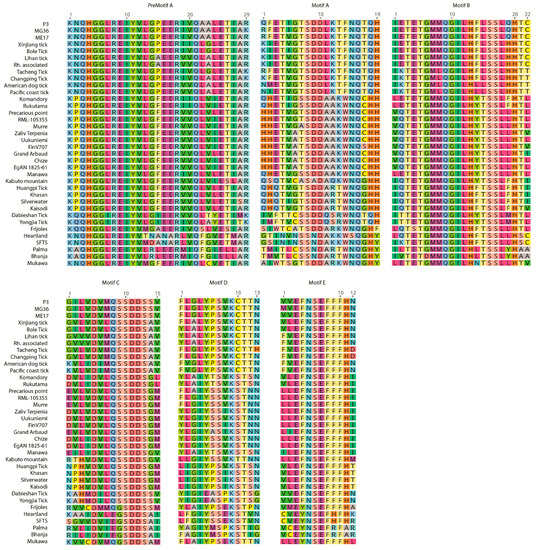 We further analyzed previously-described RNA-dependent RNA polymerase regions identified in phlebovirus genomes, including tick-associated strains []. Region I and II are located in the amino terminus of the enzyme and conserved in arena and bunyaviruses []. Centrally-located region III is present in all RNA viruses with RNA polymerase-based replication and contains the polymerase motifs preA, A to E []. Additional conserved regions (IV to VI) have also been described, and likely to participate in polymerase functions []. We aligned and deduced polyproteins obtained from Anatolia and observed identical polymerase motifs B–D and region V. The remaining motifs and regions were significantly conserved, with few amino acid substitutions consistent with phylogenetic clades. Then, we selected representative sequences from each clade (P3, MG35, and ME17) and aligned these with other tick-associated phleboviruses. Overall, unique amino acid patterns were observed in sequences from Anatolia for regions I–VI and in region III specific motifs, compared to major tick phleboviruses (Figure 5, Figure S5). Related viruses were noted as the Xinjiang tick phlebovirus, Bole tick Virus 1, Rhipicephalus-associated phlebovirus 1, and Lihan tick virus, with 80%–93.1% identities in region III motifs and 55.8%–88% identities in the remaining regions.