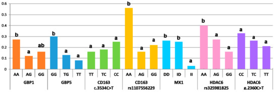 Abortion probability during a PRRSV outbreak by marker genotype (data pooled from the two studied populations). Within each marker, the genotypes with different superscripts indicate differences in the abortion ratio (p < 0.05).
